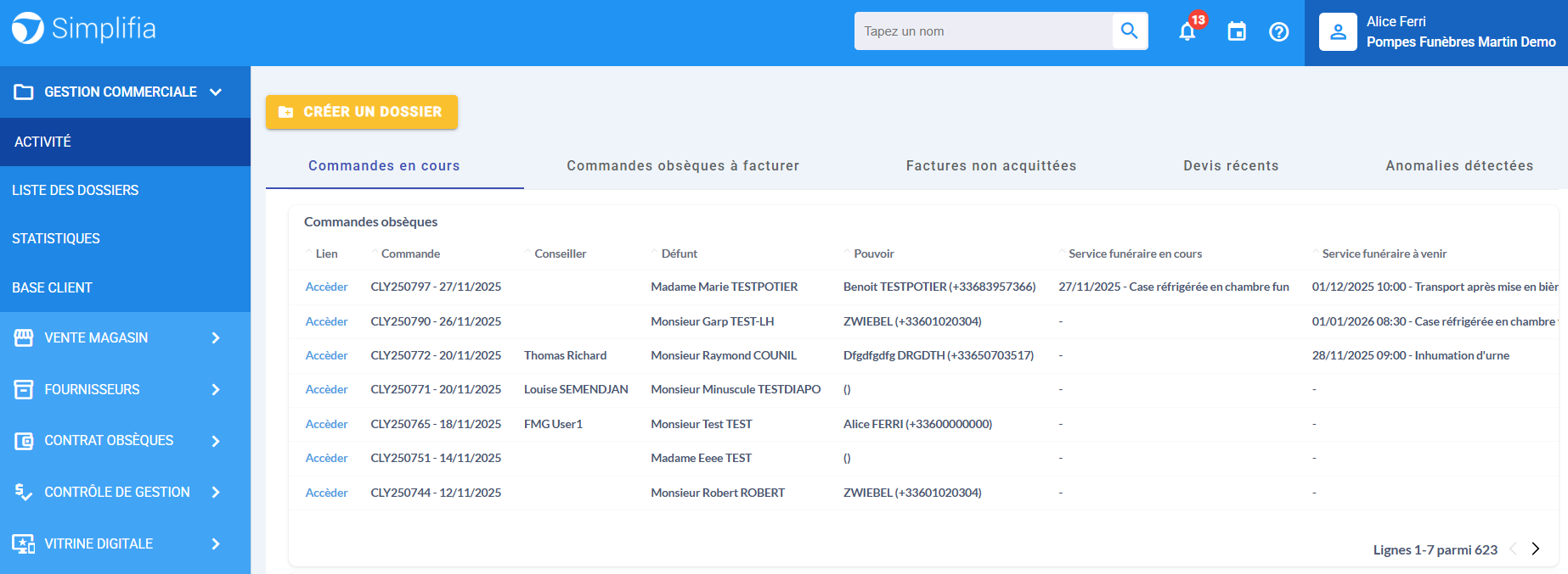 Retrouvez ici la liste des commandes obsèques ayant des services funéraires en cours ou à venir. Il vous suffira de cliquer sur "Accéder" pour rentrer dans le dossier.