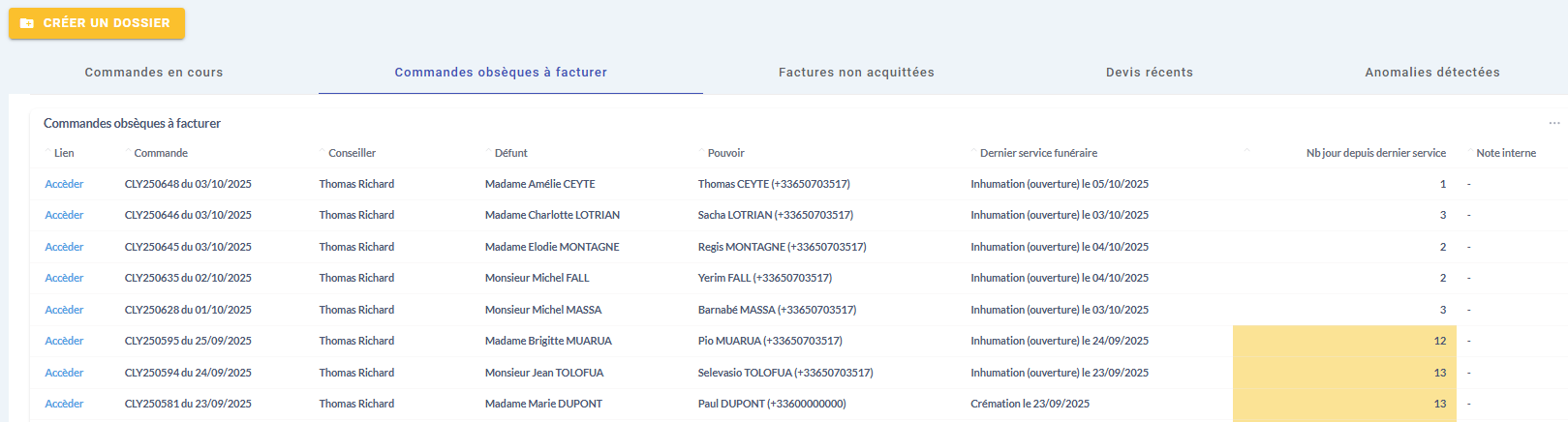 Retrouvez ici la liste des commandes obsèques n'ayant plus de services funéraires en cours ou à venir. Il vous suffira de cliquer sur "Accéder" et de passer en facturation la commande concernée.