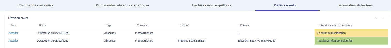 Retrouvez ici les devis créés il y a moins de 3 jours. Un indicateur de couleur vous informera de l'état des services funéraires. Ainsi, si tous les services funéraires sont planifiés, vous pourrez passer votre devis en commande.