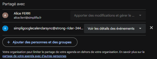- Rentrez l’adresse simpligooglecalendarsync@strong-rider-244409.iam.gserviceaccount.com avec les Autorisations “Modifier les événements”. Cliquez sur Envoyer pour fermer la fenêtre.