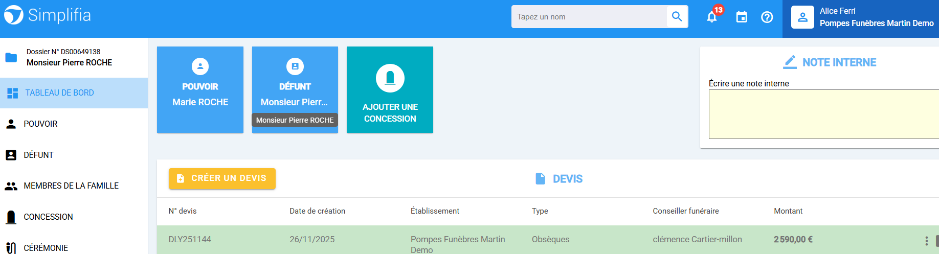 1️⃣ Aller sur le dossier concerné et cliquez sur la fiche du défunt.