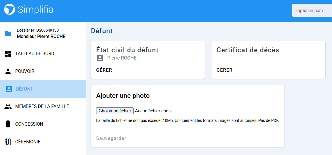 Il est possible d'ajouter la photo du défunt dans le logiciel Simplifia. Cette photo s'affichera ensuite sur l'Espace Hommage du défunt et sera également en page de couverture du Livre Hommage.