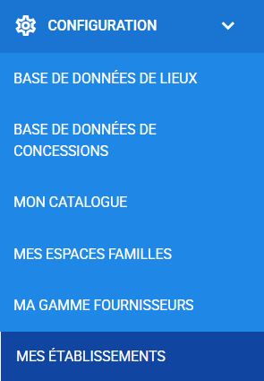 1️⃣ Cliquez sur l'onglet "Configuration" dans le menu de gauche puis sur "Mes établissements".