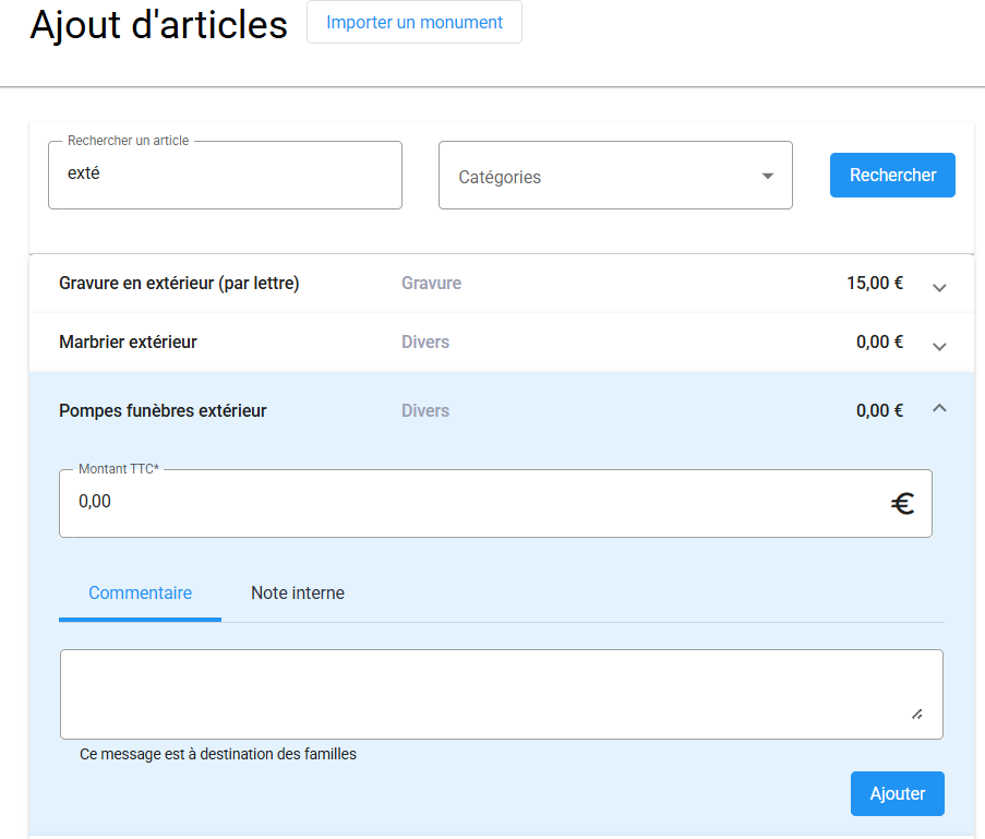 2️⃣Sélectionnez l'article de votre choix du type "Pompes Funèbres extérieur".