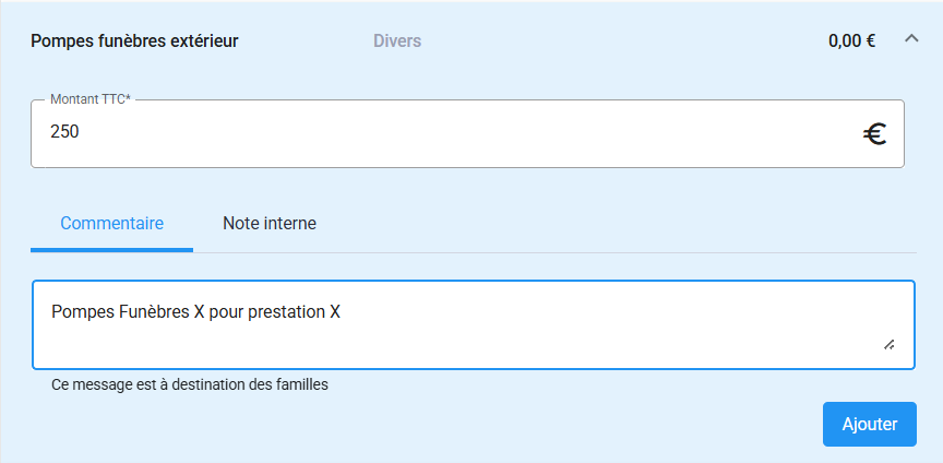 Nous vous conseillons d'ajouter un article "Pompes Funèbres extérieur" et de rentrer le montant de leurs prestations.