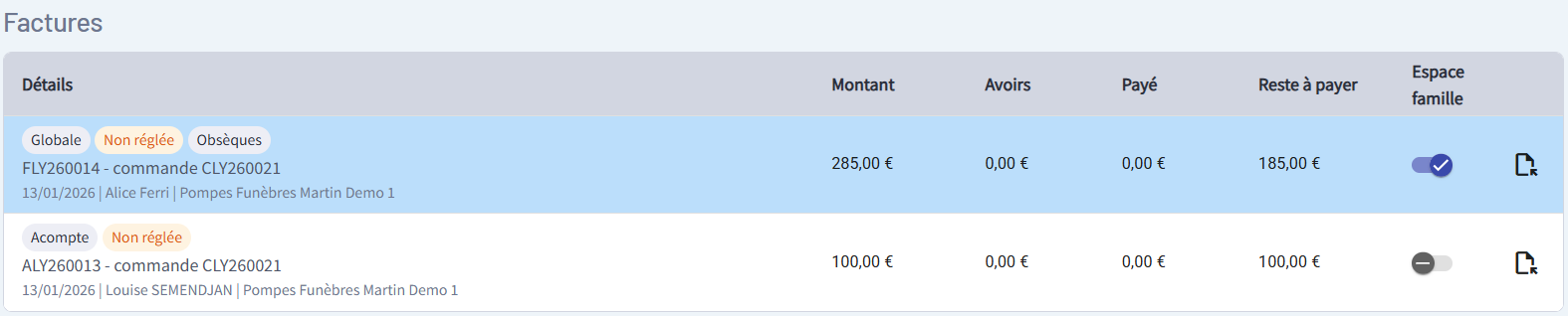 Vous pouvez vérifier sur votre tableau de bord de dossier toutes les factures liées à une même commande.