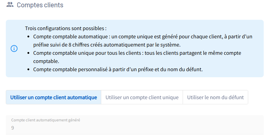 C'est un compte unique qui est généré pour chaque client, à partir d’un préfixe unique suivi de 8 chiffres créés automatiquement par le logiciel.