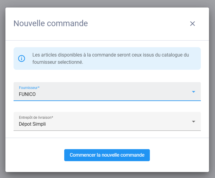 2️⃣Sélectionnez le fournisseur et votre entrepôt dans lequel seront stockés les articles.