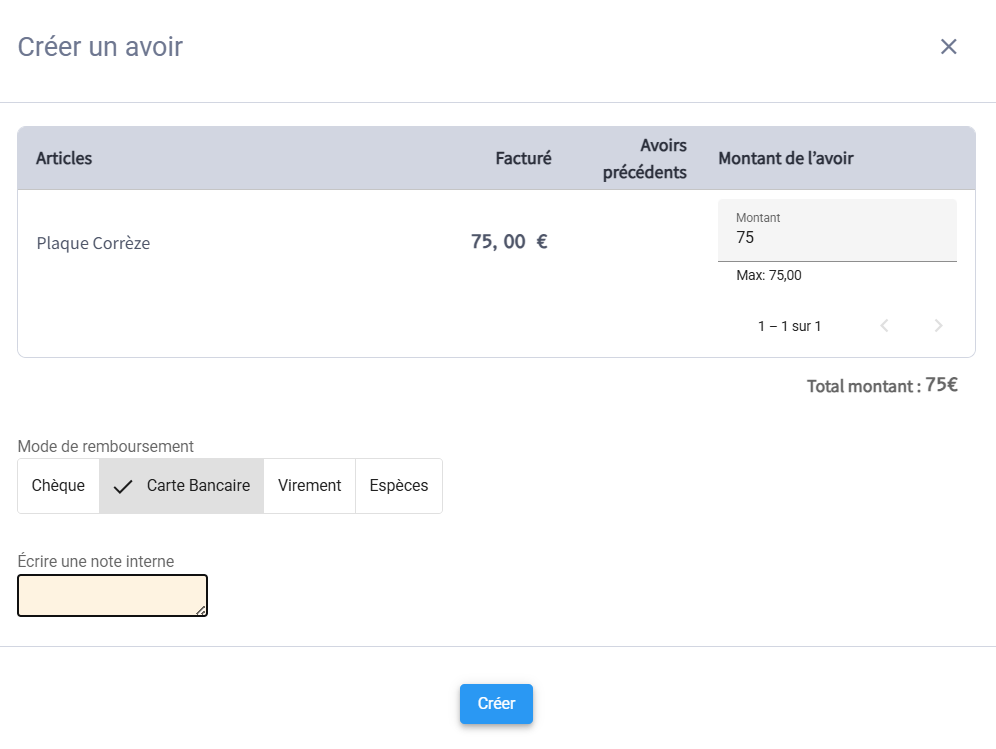2️⃣ Confirmez le montant à rembourser, validez le mode de remboursement et cliquez sur "créer".