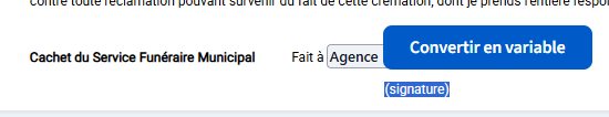 Sélectionnez ou ajoutez le texte qui nécessite une variable de signature et cliquez sur "Convertir en variable"