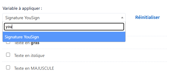 Ensuite sur la colonne de droite, cherchez le type de variable que vous souhaitez appliquer (ici c'est le bloc de signature YouSign).