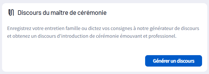 Afin de faciliter le travail du maitre de cérémonie pendant l'entretien avec la famille, vous pouvez utiliser le générateur de discours disponible dans l'onglet de gestion de cérémonie.
