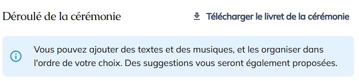 Lorsque vous avez fini avec le déroulé de votre cérémonie, vous pouvez télécharger un livret de cérémonie imprimable que vous pouvez donner à vos familles mais aussi pour le maitre de cérémonie.
