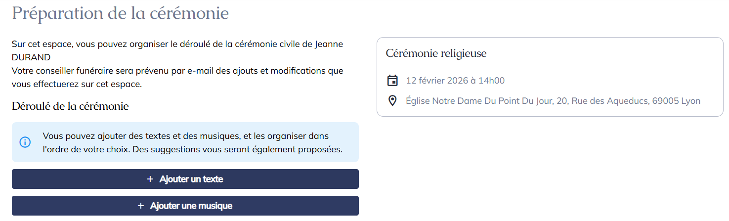 ⚠️ La gestion et la diffusion des musiques ne sont pas intégrées à cet outil. Les morceaux doivent être préparés et diffusés via une plateforme externe, en amont de la cérémonie.