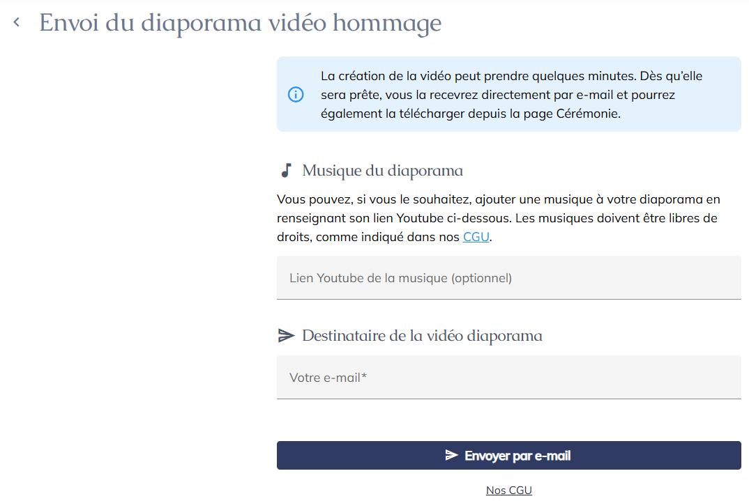Renseignez un destinataire de vidéo et ajoutez un lien YouTube si vous souhaitez personnaliser la musique.