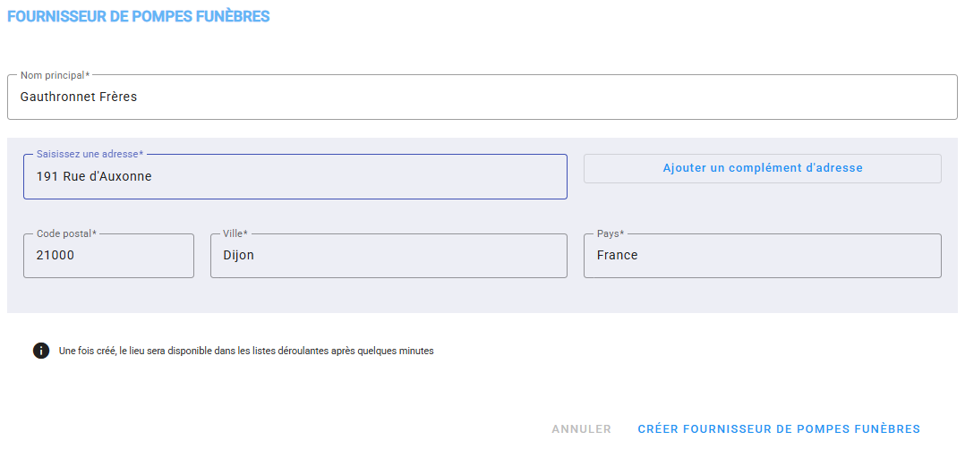 3️⃣ Cliquer sur “Créer Fournisseur de Pompes Funèbres”.