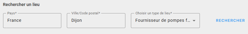 2️⃣Rechercher le lieu qu’on veut créer afin de vérifier qu’il n'existe pas encore. Pour cela, il faut indiquer la ville ou le code postal et le type de lieu. Cliquer ensuite sur “RECHERCHER”.