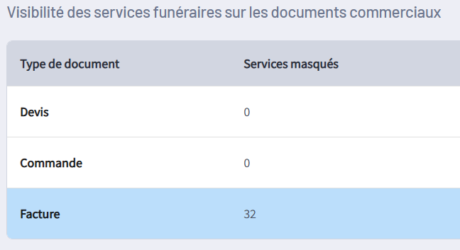 2️⃣Sélectionnez le type de document concerné par les services masqués dans "Visibilité des services funéraires sur les documents commerciaux".