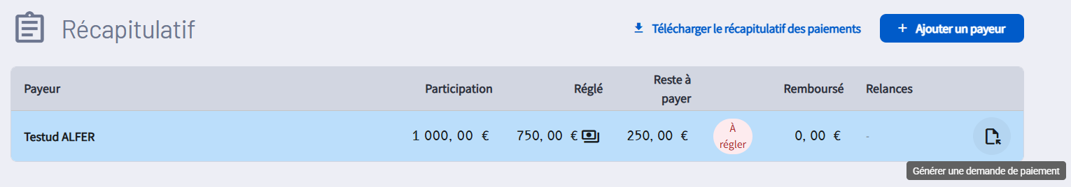 Retournez dans l'onglet "Récapitulatif" de votre interface de facture et cliquez en bout de ligne sur le bouton "Générer une demande de paiement".